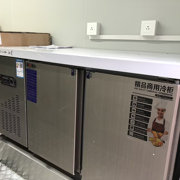 • Stainless Steel Workstation: Features a spacious, stain-resistant white countertop with a built-in commercial refrigerator underneath (bearing a “Premium Commercial Refrigeration” label to ensure optimal food preservation);