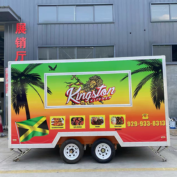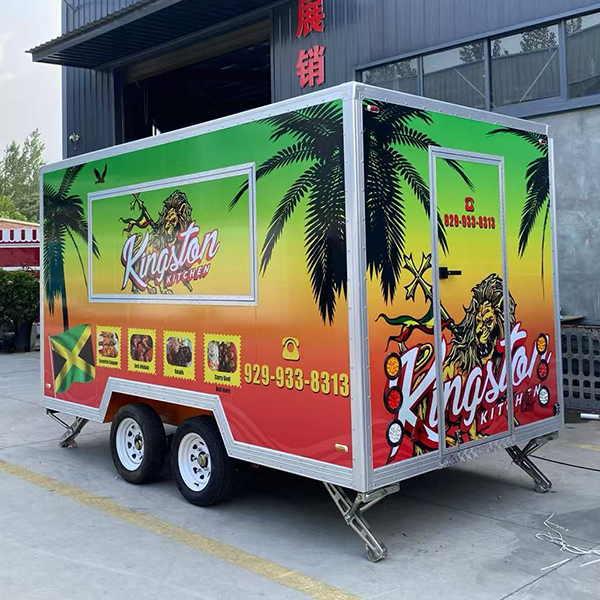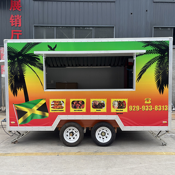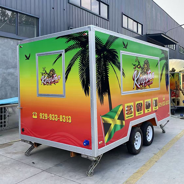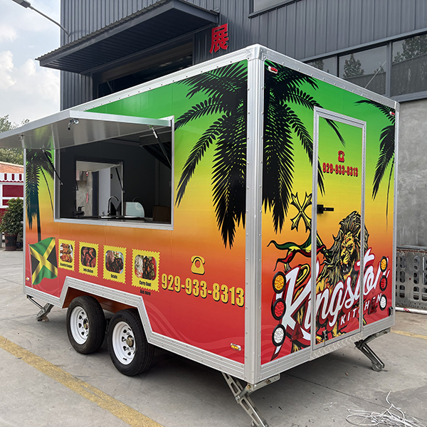 The 13ft full sticker square food trailer features a body design with a gradient color scheme—transitioning from deep green at the top to orange-yellow in the middle, and finally to red at the base. This is complemented by tropical-themed elements such as palm trees, soaring eagles, lion motifs, and the Jamaican flag. The exterior sides display the brand name, high-quality photos of the menu items, and contact information. Constructed with a square-profile body and finished with silver aluminum alloy trim, the trailer is equipped with a dual-axle wheel system and adjustable support legs. Measuring 13 feet in length, it is compatible with standard trailer hitches, making it ideally suited for operation in urban streets, narrow commercial districts, and similar environments.