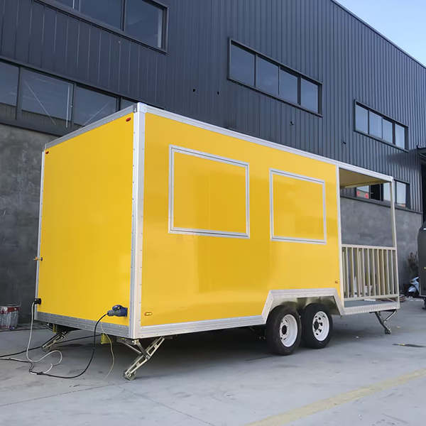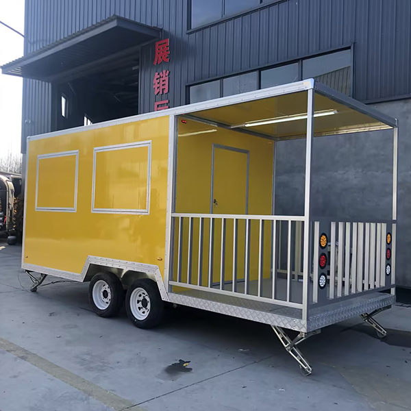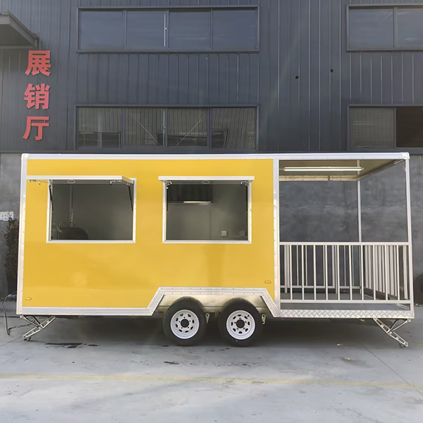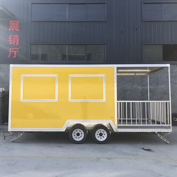 The 15ft yellow double windows square food trailer features a bright yellow body with silver metallic trim and a non-slip textured chassis, making it highly visible and practical for outdoor use. It has double rectangular service windows on both sides, with open service platforms with guardrails extending from the sides and rear. The dual-axle, four-wheel chassis enhances driving stability (suitable for complex road conditions), and adjustable support legs ensure a secure and slip-resistant parking position. External power and drainage outlets are provided at the rear and sides for water and electricity replenishment. The overall layout adopts a “closed operating area + open service area” design—the front and middle sections are enclosed food processing spaces, while the rear and sides are customer service areas, achieving efficient integration of “production-sales”.