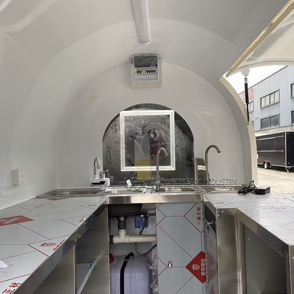 The 7.2ft white small round food trailer is a compact, functional, and charming mobile kitchen, featuring a bright white rounded exterior that enhances visibility and interior space. Built on a sturdy single-axle chassis for stability and easy towing, it includes a service window and counter for efficient customer service, making it an ideal choice for vendors seeking a distinctive and user-friendly option.